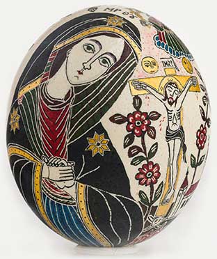Icoanele încondeiate pe ouă de strut ilustrează principalele teme iconografice specifice picturii pe sticlă, după cum urmează: